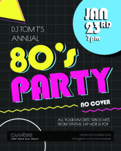 After a LONG hiatus, it’s BACK! DJ Tom T’s Annual 80’s Party at the all new Cannons Bar – Detroit, MI on 1/23/2026. I’ll be spinning all of your favorite 80’s jams – from syths, to hip hop, to pop classics & more. As always at my 80’s Party, feel free to dress the part. Wear your finest 80’s gear and rock it out on the dance floor.